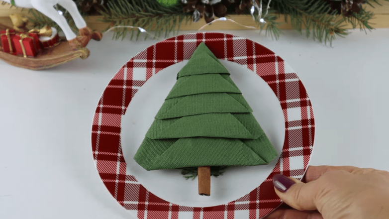 С елочкой все еще проще. Здесь салфетку не придется даже разворачивать. Укладываем салфетку ромбом так, чтобы свободные края оказались сверху. Поочередно загибаем на себя слой за слоем, выдерживая одинаковое расстояние. Затем аккуратно переворачиваем и сводим углы к середине так, как и при формировании колпачка.