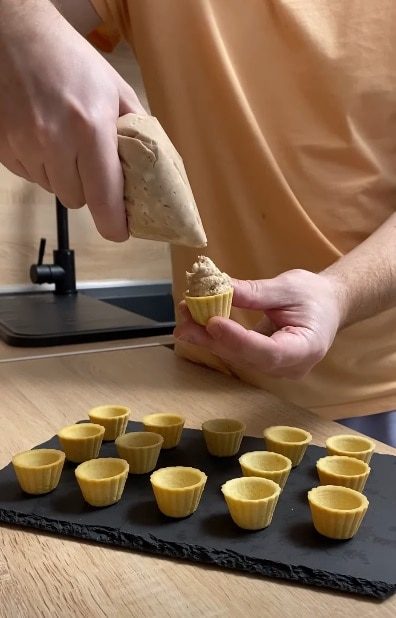 Полученную однородную рыбную массу переложите в кондитерский мешок и наполните ей тарталетки.
