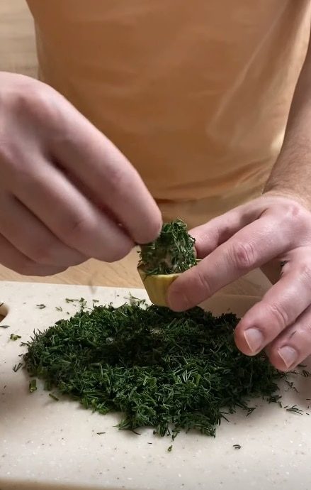 Каждую тарталетку оформите зеленью укропа, так закуска станет похожа на елочку.