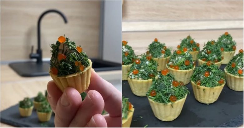 Завершите приготовление закуски, оформив елочки икринками, как игрушками.