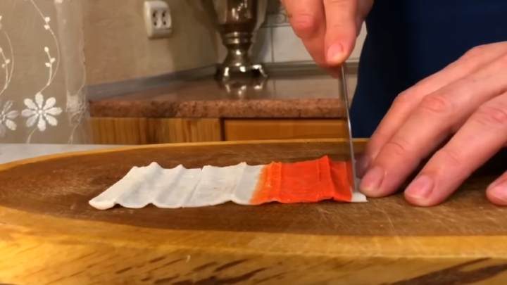 Отрежьте у оставшейся крабовой палочки край, слегка закруглите его.