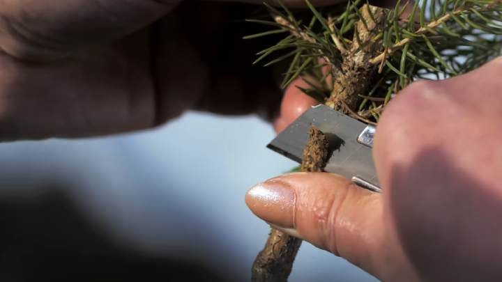 Теперь острым ножом сделайте надрез на саженце примерно 4 см длиной.