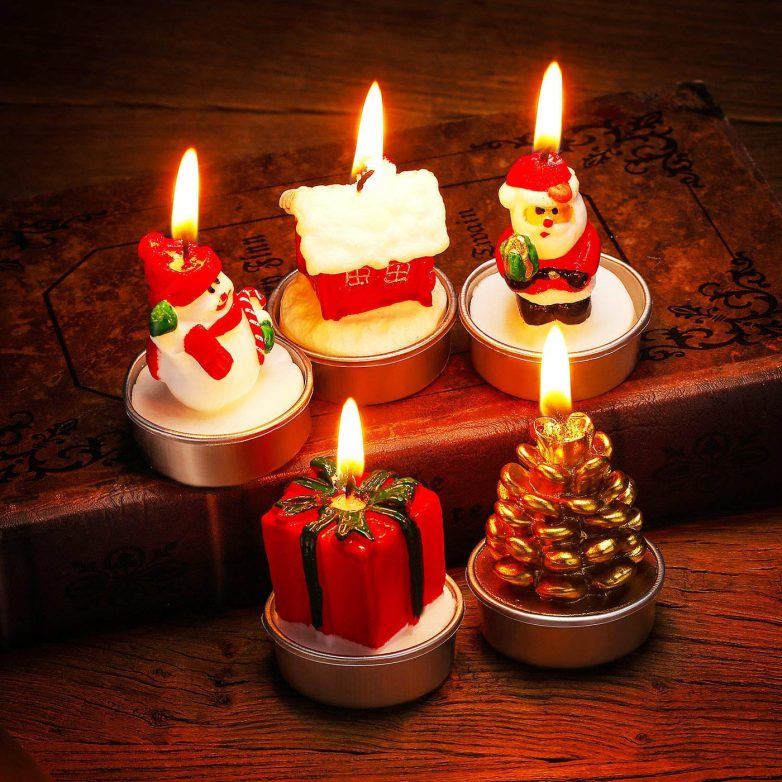 Новогодняя атрибутика широко используется в выпуске свечей. Свечи в виде фигурок Деда Мороза, Санта-Клауса, заснеженного домика, мишки особенно нравятся детям, усиливая восторг от новогоднего торжества.
