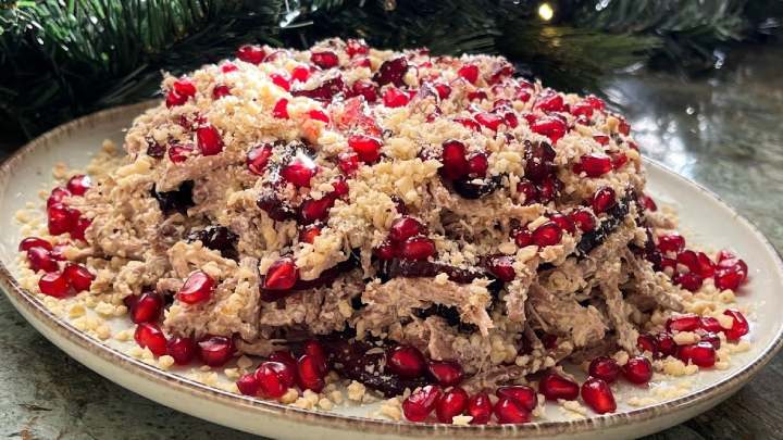 Нарежьте чернослив. Соберите салат слоями: примерно 30 % мяса, потом чернослив, немного зёрен граната, снова мясо и т. д.