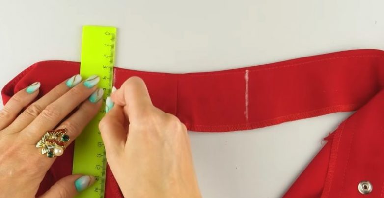 Подготовьте подходящую по цвету лампасную ленту шириной 4 см. От центрального заднего шва пояса отложите в обе стороны по 6 см.