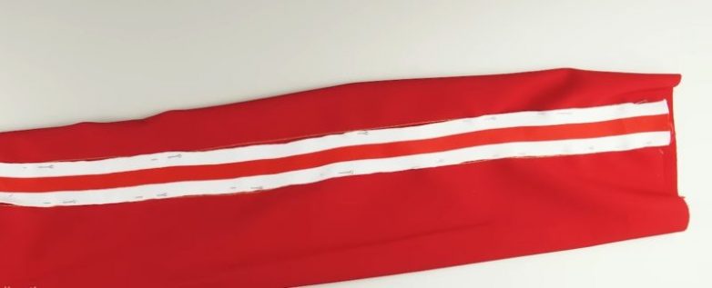 Распоротые боковые швы разутюжьте, обработайте их на оверлоке. Вколите и вшейте лампасную ленту.