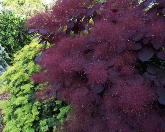 Среди красных кустарников особое внимание стоит обратить на скумпию кожевенную. Взрослое растение может выглядеть как изящное деревце с ветвистой кроной в форме шара или зонта. Особое очарование скумпии придает необычная листва: сизовато-зеленые листья на длинных черешках к осени приобретают огненно-красную окраску, которая затем меняется на рыжую или бордовую. Существуют также сорта скумпии, чья листва остается в красной гамме весь сезон. Например, такова скумпия гибридная Грейс (Grace): ее листья весной и летом винно-красные, ранней осенью становятся красновато-синими, а перед опаданием приобретают насыщенный огненно-красный цвет.