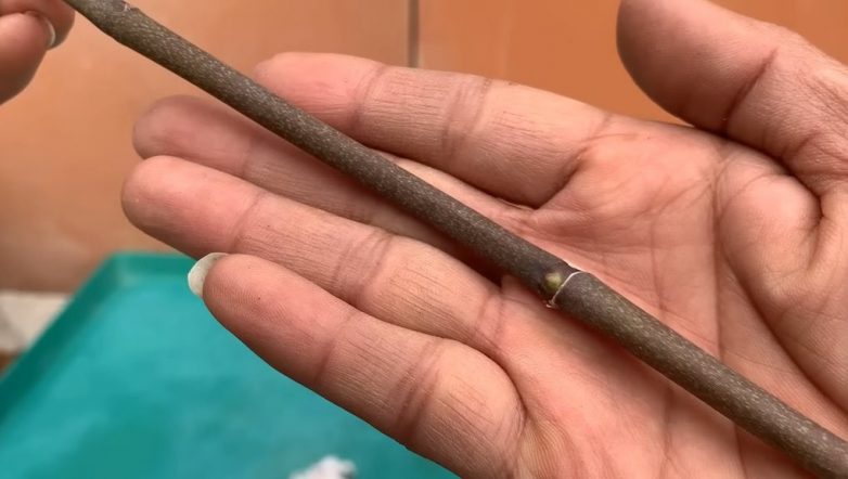 Следующий важный шаг — запаивание концов веточек с помощью свечного воска. Эта процедура необходима для того чтобы защитить веточки от попадания болезнетворных бактерий и грибка. Благодаря свечному воску веточки не загниют в процессе размножения растения.