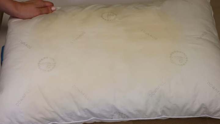 Либо воспользоваться вторым способом удаления жёлтых пятен: растворить 3-4 мерные ложки кислородного отбеливателя в горячей воде, погрузить подушку на 10-15 минут, а затем постирать.