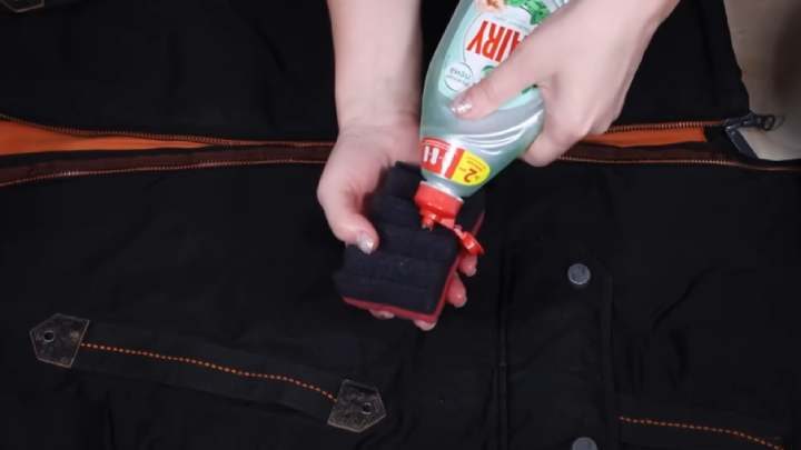 Засаленные, жирные пятна лучше всего удаляются обычным фейри. Нанесите немного на губку и протрите засаленные участки на сухой куртке. Затем отправьте в стирку.