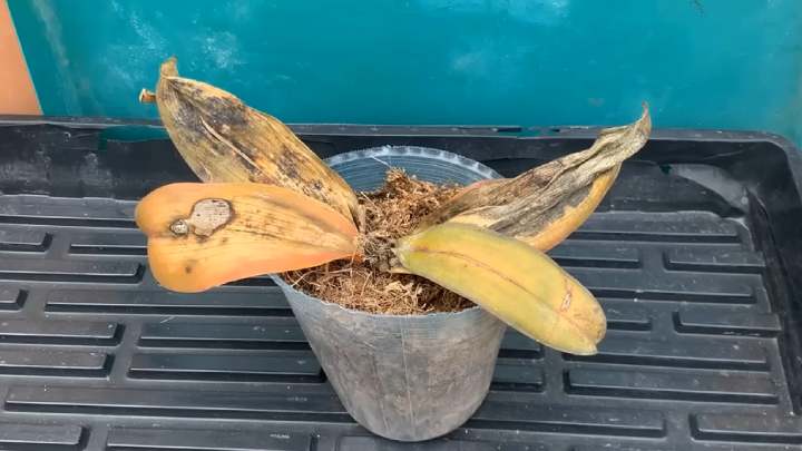 Накройте пластиковой бутылкой с отверстиями для воздуха. Бутылку не убирайте 3 месяца. Поливайте по мере необходимости. Не переливайте орхидею!