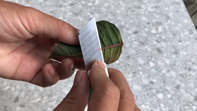 Срежьте тонкий слой центральной прожилки с внутренней стороны листочка.
