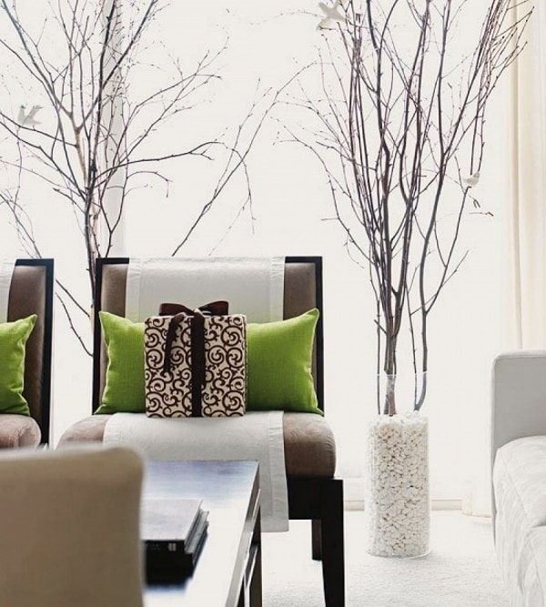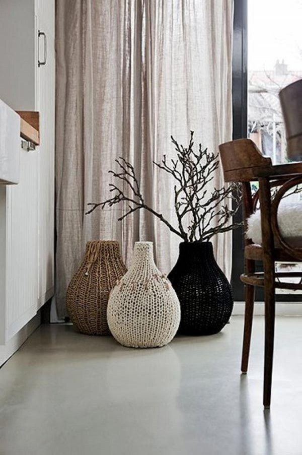 Лучше, что бы напольные вазы подходили к домашнему декору и цветам, и подчеркивали их. Вазы из прозрачного стекла сами по себе выглядят очень современно, какой бы формы они бы не были. Заполните их ветками на ваш выбор: искусственными цветами или листьями. Вы можете положить внутрь ветки березы, чтобы придать естественность современному декору, и наполнить вазы стеклянными камешками, чтобы ветки были устойчивыми. Если вы хотите привлечь внимание, раскрасьте вазу омбре или только небольшую ее часть яркой краской. В зимний период накройте вазы вязаным декором и поставьте внутрь вечнозеленые растения.