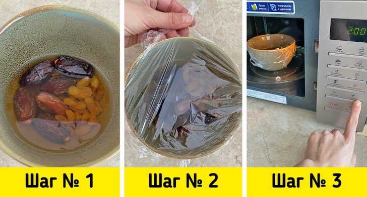 Если по рецепту для выпечки сухофрукты необходимо замочить на ночь в воде или чае, а вы об этом забыли, на помощь снова придет микроволновка. Просто положите сухофрукты в миску, пригодную для микроволновой печи, залейте их нужной жидкостью, накройте пленкой и нагревайте на высокой мощности в течение 2 минут. Затем выньте из печи и оставьте на столе на 5 минут (приводим время из расчета на 4 чашки или 1 кг фруктов и 1/4 чашки или 60 мл жидкости). Дайте сухофруктам остыть, прежде чем добавлять в тесто.