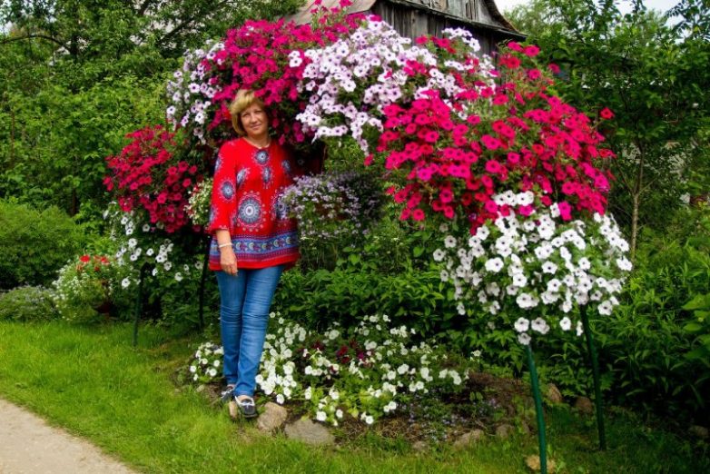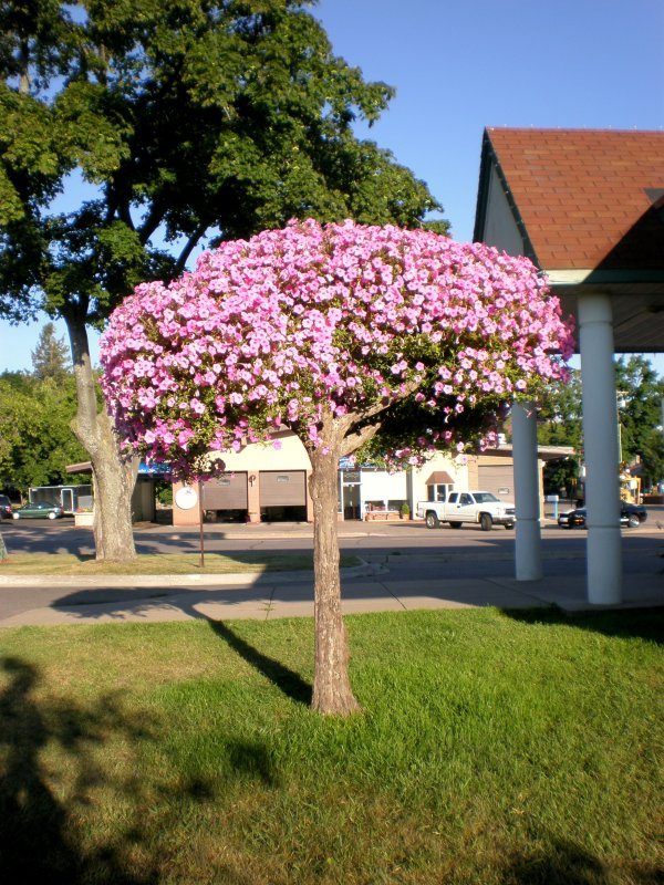 Если вы хотите воплотить в саду какую-нибудь оригинальную идею, то попробуйте своими руками сформировать оригинальное дерево из петунии. Каркас для петуниевого дерева может быть сделан из металла. В качестве основы можно смело использовать ствол от старого высохшего дерева на участке. И в том и в другом случае конструкция с яркими цветами петунии будет выглядеть очень эффектно.