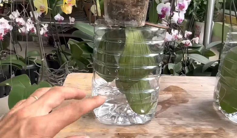 Конструкцию с орхидеей поместите в обрезанную пятилитровую бутылку с небольшим количеством воды таким образом, чтобы листья слегка касались воды.