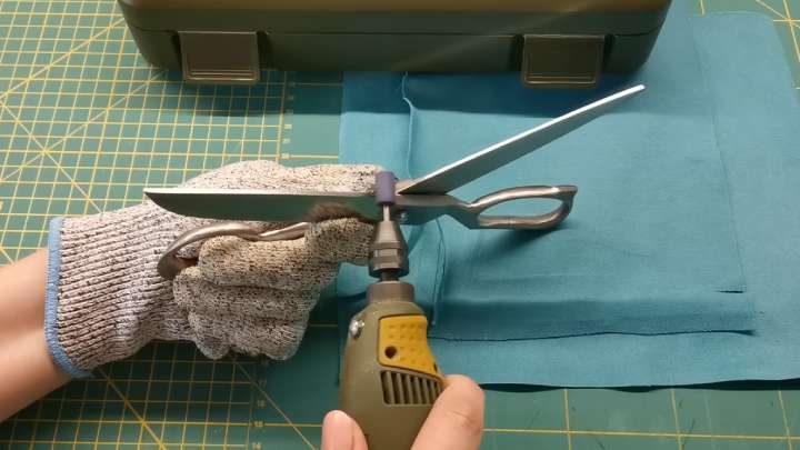 Определите угол наклона и по нему пройдитесь дрелью, чтобы заточить ножницы (или нож).