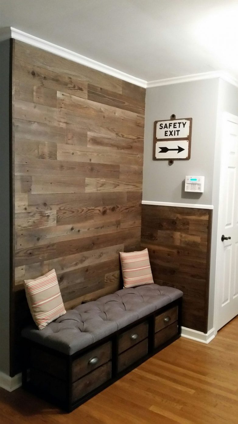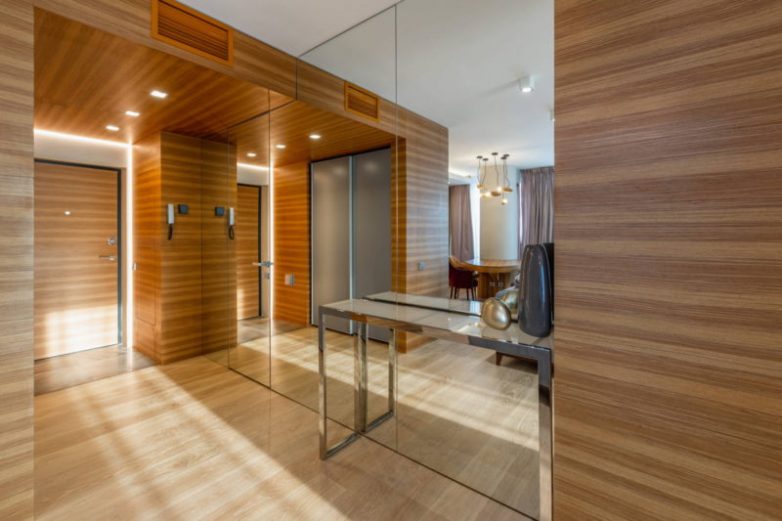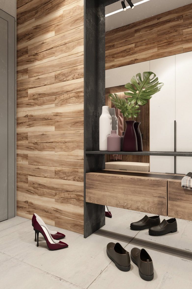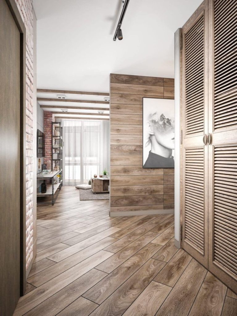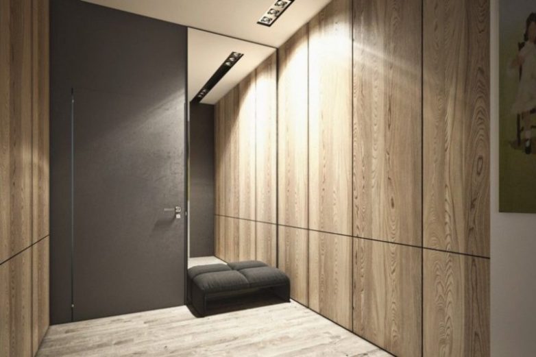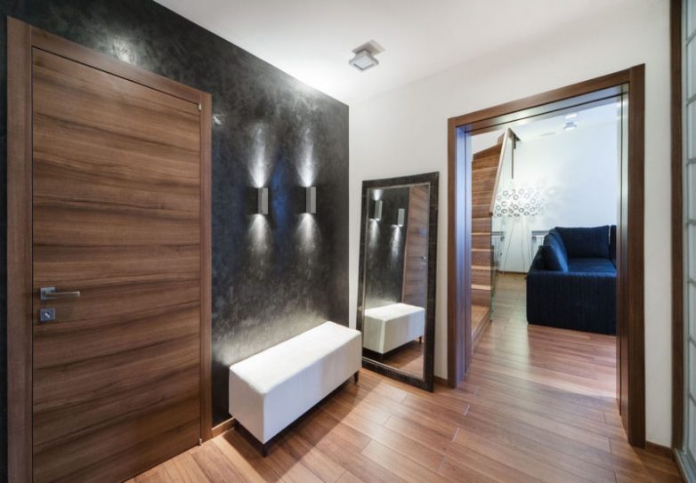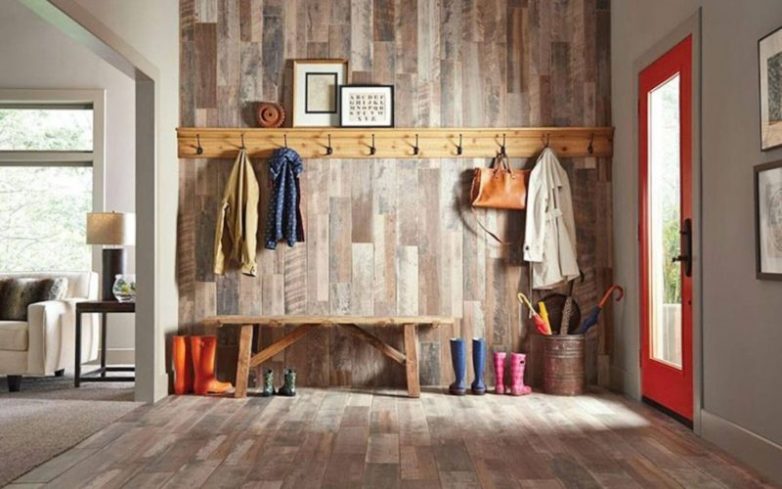Ламинат на стене в интерьере смотрится очень стильно. Это долговечный материал, за которым очень легко ухаживать — достаточно просто протереть ламинат тряпкой, чтобы избавиться от разного рода загрязнений. Отличной идеей станет использование ламината в прихожей, где его можно использовать не только на стенах, но и на полу. Такой подход к оформлению поможет визуально расширить пространство, что особенно актуально для небольших коридоров.