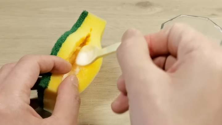 Надрежьте губку сбоку. Всыпьте немного соли, распределите внутри.