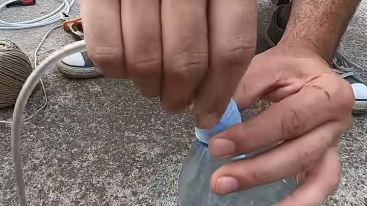 У пластиковых 1,5 л бутылок отрежьте дно. В крышке сделайте отверстие с помощью паяльника или раскалённого гвоздя. Также проделайте два отверстия сверху, возле дна, чтобы бутылку можно было подвесить за хомуты.