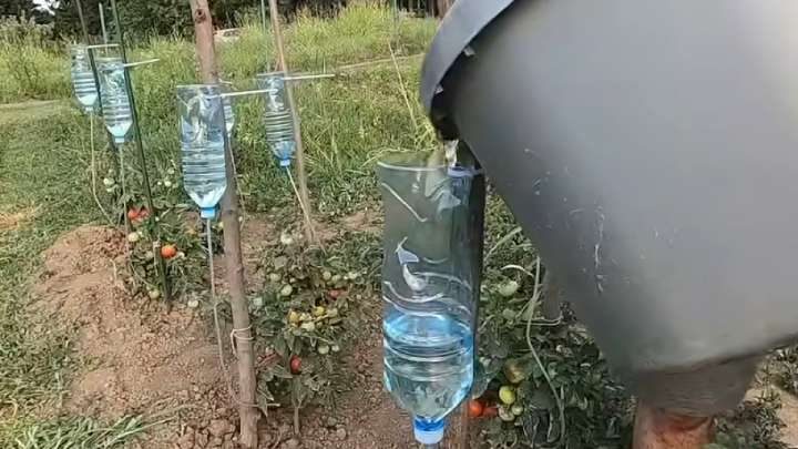 Потихоньку вода будет капать через верёвку на грядку, поливая растения!