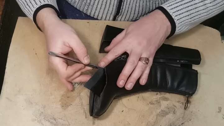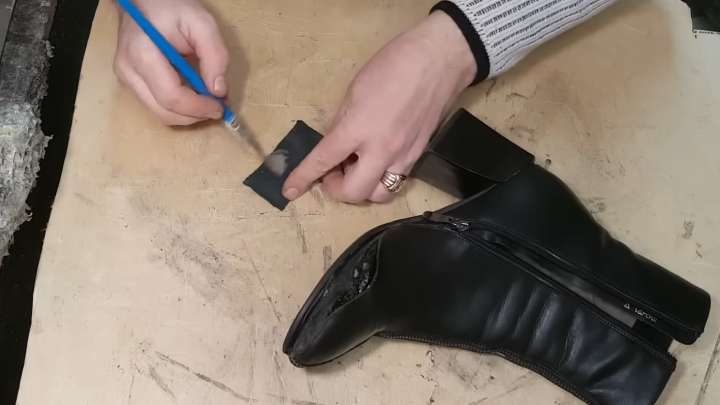 Сперва нужно нагреть феном место лопнувшей кожи, чтобы отсоединить подошву. Следом подошву нужно зачистить от остатков старого клея. Из кожи подходящего цвета вырезать заплатку, подходящую по размерам. Края заплатки зачистить, чтобы убрать верхний слой кожи — тогда заплатку не будет видно на обуви.