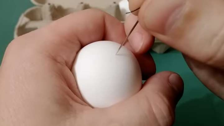 Перед варкой возьмите яйцо, поверните к себе тупой стороной. Возьмите иглу и сделайте небольшое отверстие.