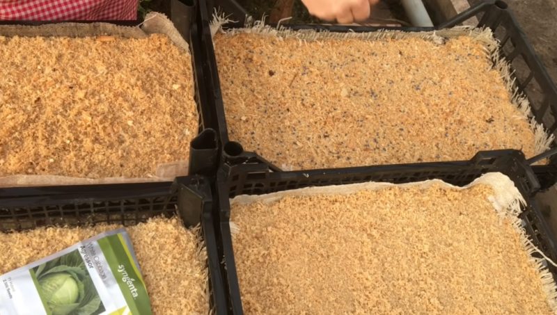 Неглубокие пластиковые ящики застелите подстилкой из мешковины. Сверху на подстилку насыпьте слой мелкой опилки толщиной около 3 см. Обильно пролейте опилки большим количеством воды. Посейте капусту просто равномерно разбросав семена по поверхности увлажненных опилок.
