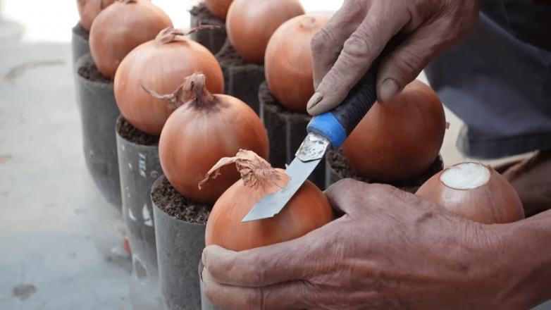Определившись с количеством посадочного материала, аккуратно срезаем с луковиц верхушки. Это необходимо для того, чтобы зелень быстрее пошла в рост.