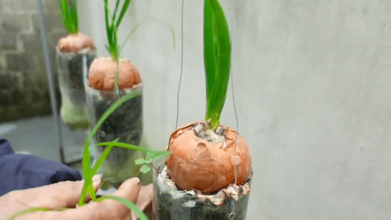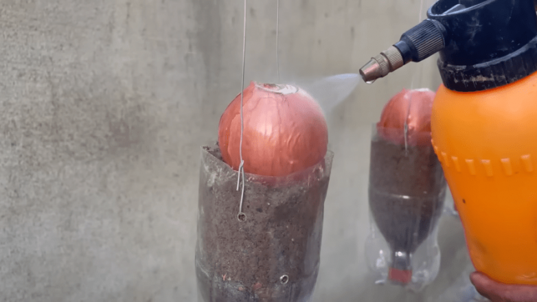 Обильно обрызгиваем луковицы сверху. Для более быстрого пробуждения корней важно, чтобы промокла не только земля, но и шелуха напиталась влагой. Дополняем контейнеры проволокой для подвесов. Заливаем воду в нижнюю часть контейнеров, а затем подвешиваем в удобном месте. Не имея собственного участка, разместить подвесы с луком всегда можно на балконе или непосредственно на окне внутри помещения.