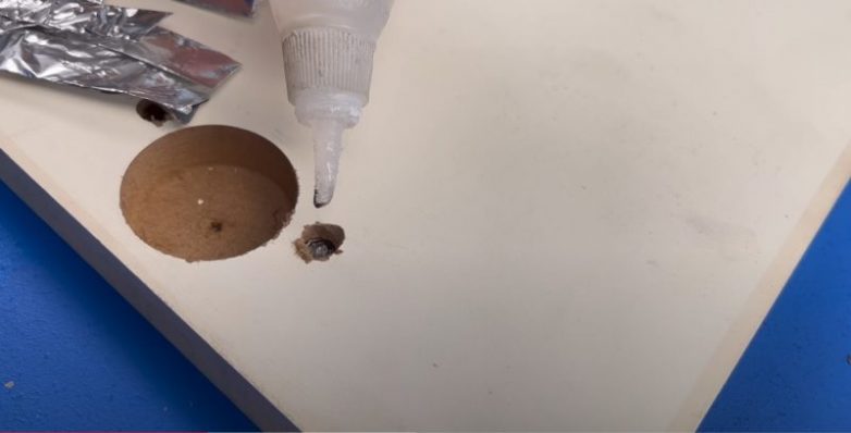 Для второго способа также необходимо снять петлю и расширить отверстия. Подготовленные отверстия необходимо полностью залить горячим клеем. После высыхания клея петлю можно будет установить на место.