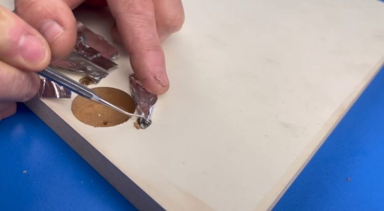 В результате отверстия должны быть полностью заполнены фольгой. Сверху на последний слой капните немного клея. После его высыхания срежьте излишки фольги, чтобы поверхность была ровной и гладкой.