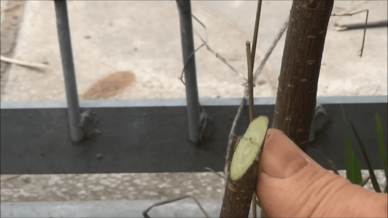 Сбоку на подвое делаем срез под небольшим наклоном к середине. С таким расчетом, чтобы место среза ориентировочно совпадало со срезом на веточке черешни.