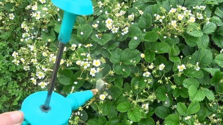 И проведите обработку кустов клубники по листьям и цветам. Такая подкормка крайне важна для хорошего плодоношения клубники!