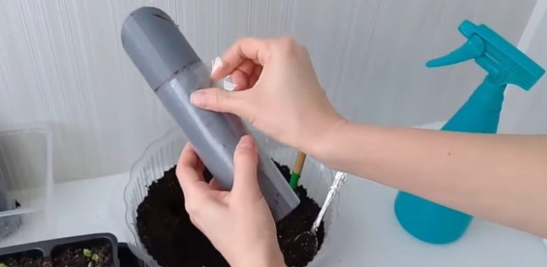 Следующим шагом из пластиковой водопроводной трубы диаметром 50 мм подготовьте специальную воронку, с помощью которой будет удобно накладывать грунт в стаканчик из пленки. Для этого отрежьте кусок трубы длиной 20 см и срежьте один из краев под углом.