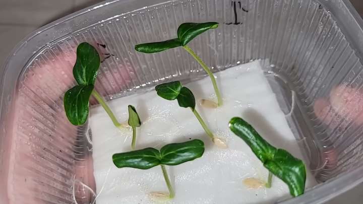 Смочите бумагу, высадите семена. Накройте крышкой, оставьте в светлом месте. Периодически подливайте воду.