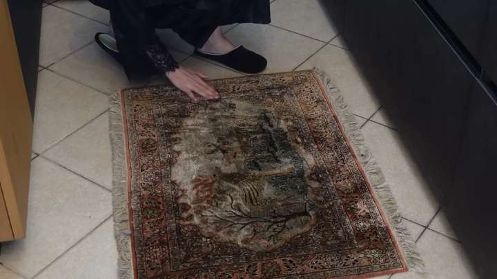 Смеси должно быть достаточно, чтобы полностью покрыть ковёр тонким слоем. Наденьте перчатки и вотрите смесь в ковёр, чтобы она проникла между ворсинками. Оставьте на 15 минут.