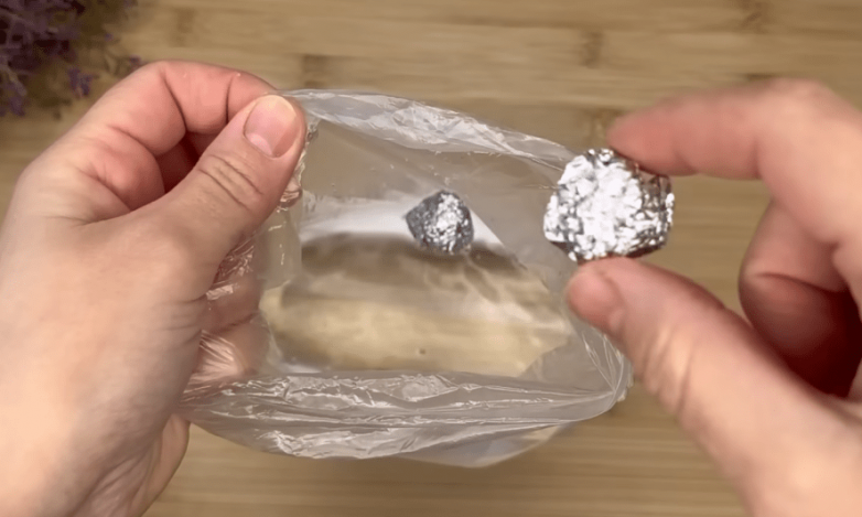 Пакет обязательно должен быть прозрачным. В идеале новым или не имеющим повреждений. Для начала берем небольшой кусок фольги, разрываем на 4 части и формируем шарики.