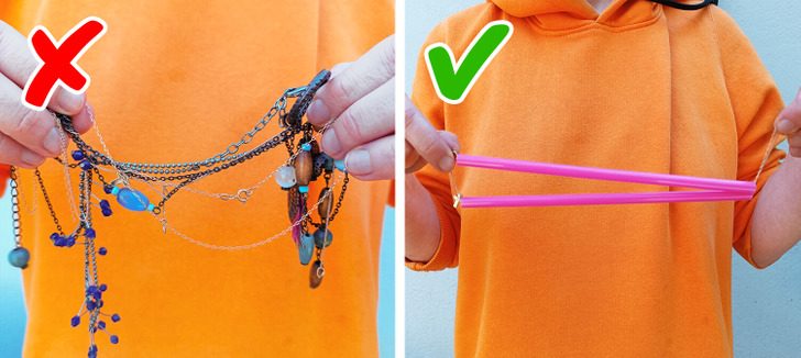 Чтобы цепочки и подвески не перепутались во время путешествия, надо продеть украшения сквозь соломинку.