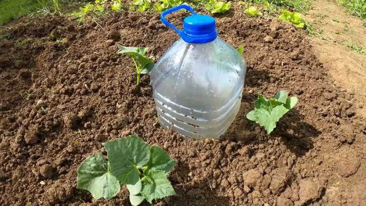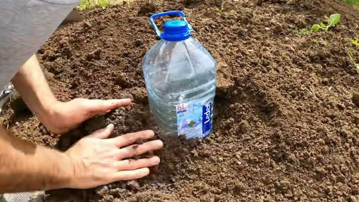 Вкопайте бутылку в грядку, где будут высажены растения.