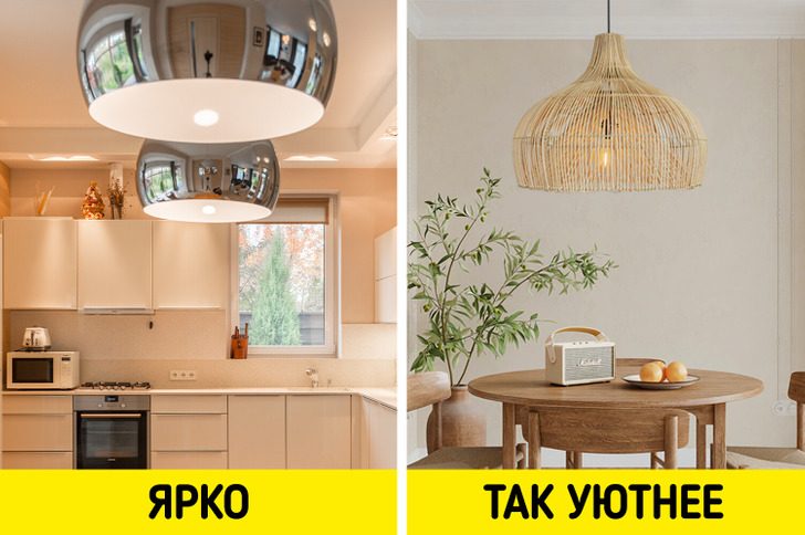 На кухне многие используют дополнительное освещение. Поэтому большие яркие лампы, которые висят над столом, можно заменить на более уютные плетеные светильники. Натуральный материал придаст помещению теплое сияние и сделает его более приятным для пребывания.