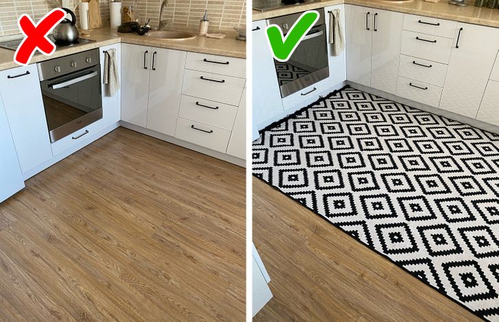 Во-первых, это отличный способ добавить цвета кухне нейтральных тонов, если выбрать яркий вариант, или уравновесить дизайн, если выбрать ковер в тон мебели. Во-вторых, такое покрытие добавляет амортизации под ногами. Кроме того, уборка будет еще легче, если постелить коврик, который можно стирать в машинке.