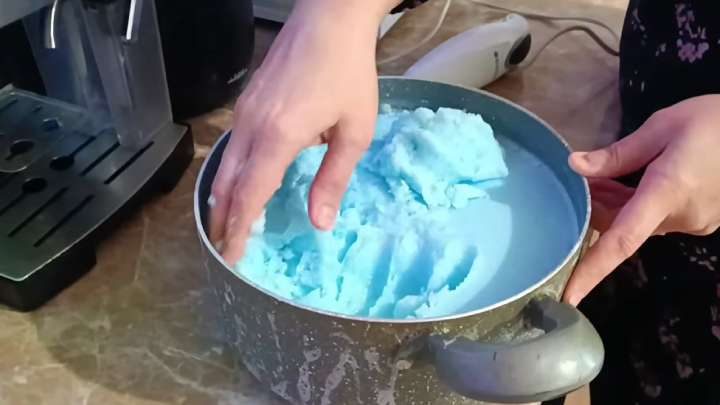 Залейте 4 л воды. Поставьте на огонь. Дождитесь растворения мыла, после чего постепенно, по ложке, всыпьте 5 ст. л. кальцинированной соды. Выключите, снимите с огня, оставьте до полного остывания на ночь.