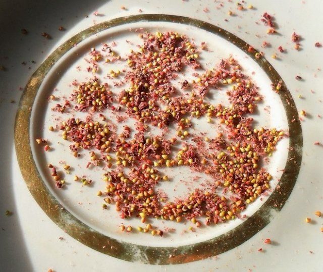Срежьте с нее верхушку и счистите ножом или лезвием верхний слой с семенами. Уложите этот слой на бумагу или плотную ткань и оставьте на 2-3 дня сушиться в теплом месте. Высохшую массу перетрите в ладонях для отделения семян.