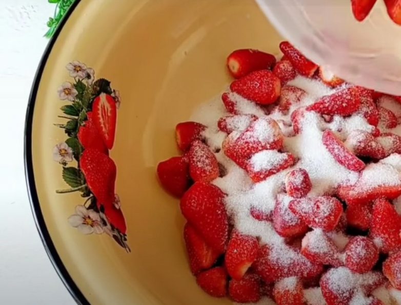Оставьте ягоды с сахаром на столе на 3 часа, за это время несколько раз аккуратно перемешайте клубнику.