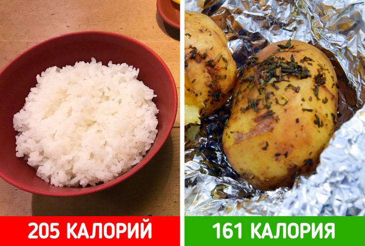 Если вы пытаетесь сбросить вес, следя за потреблением калорий и жиров, картофель или рис хорошо подойдут. Оба продукта практически не содержат жира: в каждой порции содержится менее 1 грамма. Если сравнивать калорийность, то в чашке белого риса 205 калорий, а запеченный картофель среднего размера содержит 161 калорию.