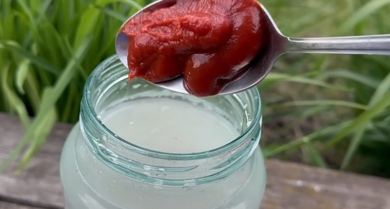 Добавьте к дрожжам 3 столовых ложки томатной пасты. Обратите внимание, что в составе томатной пасты не должно быть соли.
