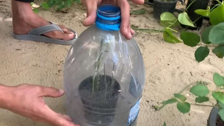 Накройте сверху бутылкой, у которой отрезано дно. Крышку не закрывайте. В таком виде оставьте розы в светлом месте без прямых солнечных лучей, с постоянной температурой 22-26 градусов. Время от времени увлажняйте из пульверизатора. Через некоторое время черенки укоренятся: вы поймёте это по маленьким листочкам, которые начнут расти на стеблях. Когда черенки нарастят достаточное количество корней, их можно будет рассадить в индивидуальные горшки.