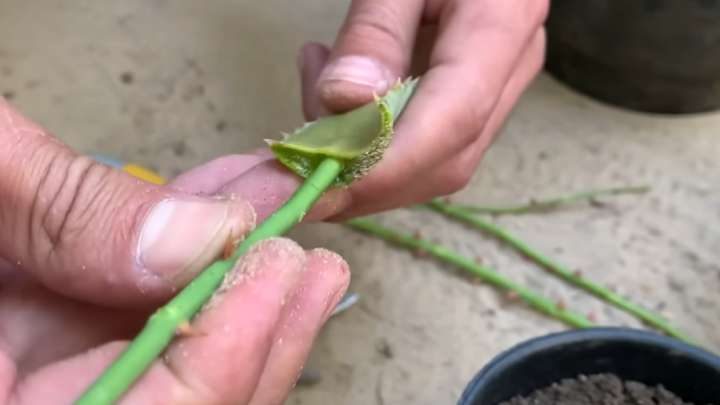 Черенки вставьте срезом в лист алоэ, чтобы тщательно промазать гелем.