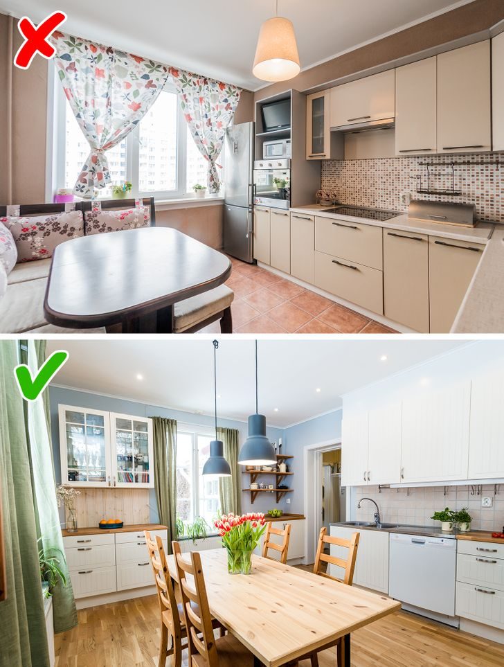 Вы можете легко освежить интерьер кухни без значительных затрат — просто добавьте шторки на стеклянные дверцы верхних шкафов. Этот элемент декора придаст вашему помещению уюта и очарования, а также скроет от глаз кухонные принадлежности. Шторки лучше всего выбирать из той же ткани, что и шторы в кухне, чтобы создать единый стиль интерьера.
